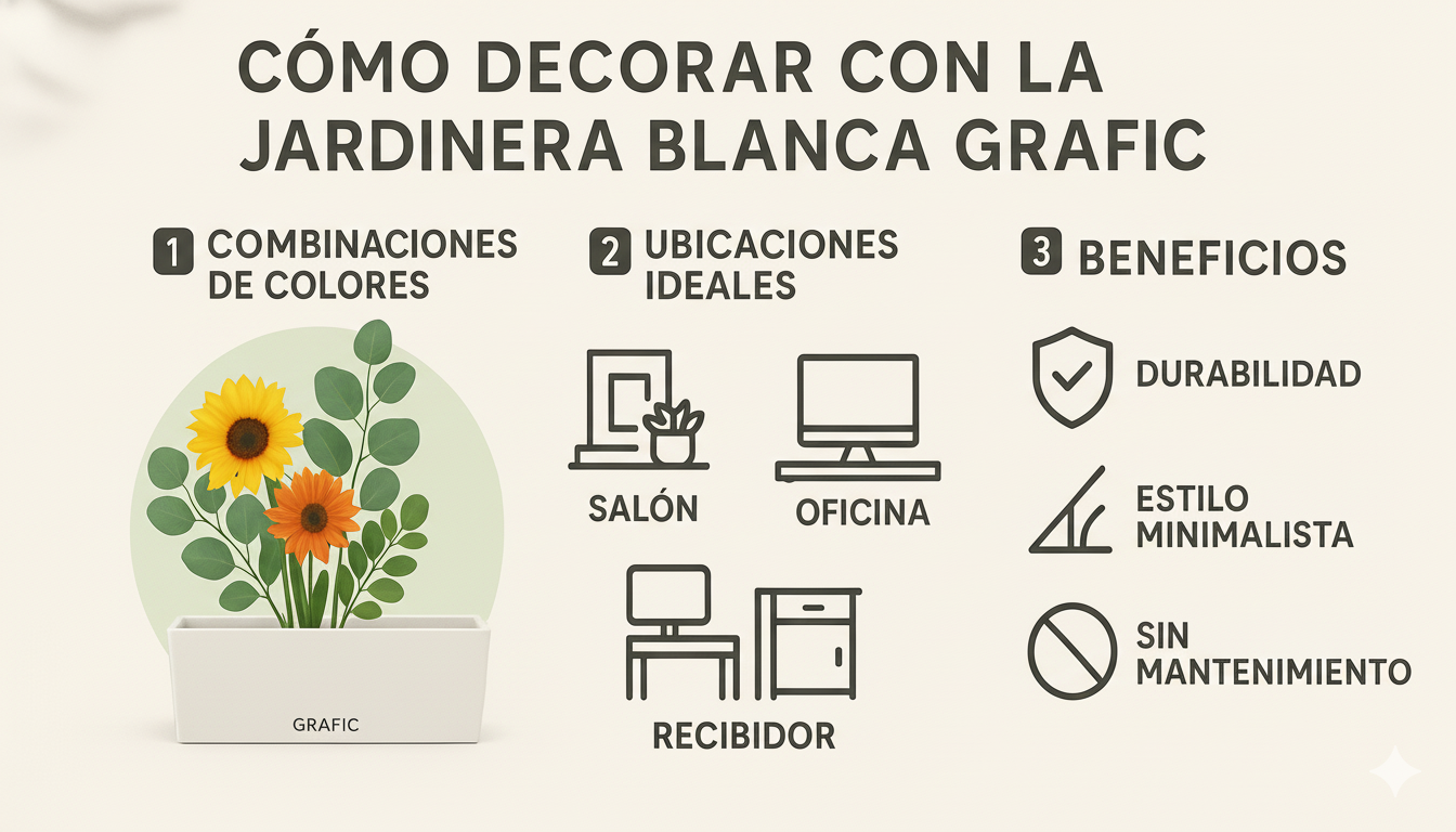 Gracias a su diseño compacto y su estética elegante, la jardinera blanca GRAFIC es ideal tanto para interiores como para zonas cubiertas al aire libre. No necesita riego, mantenimiento ni limpieza especial: basta con pasar un paño seco para mantenerla impecable.