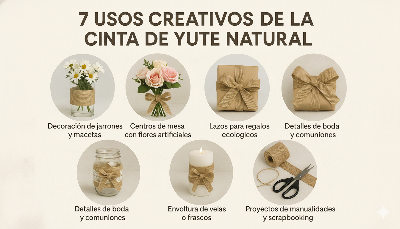Esta cinta es perfecta para dar un acabado natural a tus ramos y centros de flores artificiales. También puedes usarla para decorar velas, frascos de cristal o detalles de boda, aportando un toque rústico y elegante. Además, es un básico indispensable para envolver regalos de forma sostenible y con estilo.