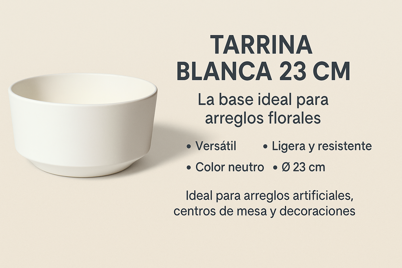 La Tarrina Blanca 23 cm es perfecta para crear arreglos florales de impacto visual. Puedes usarla en comedores, recibidores, salones, restaurantes o eventos, aportando equilibrio y una estética cuidada en cada composición.