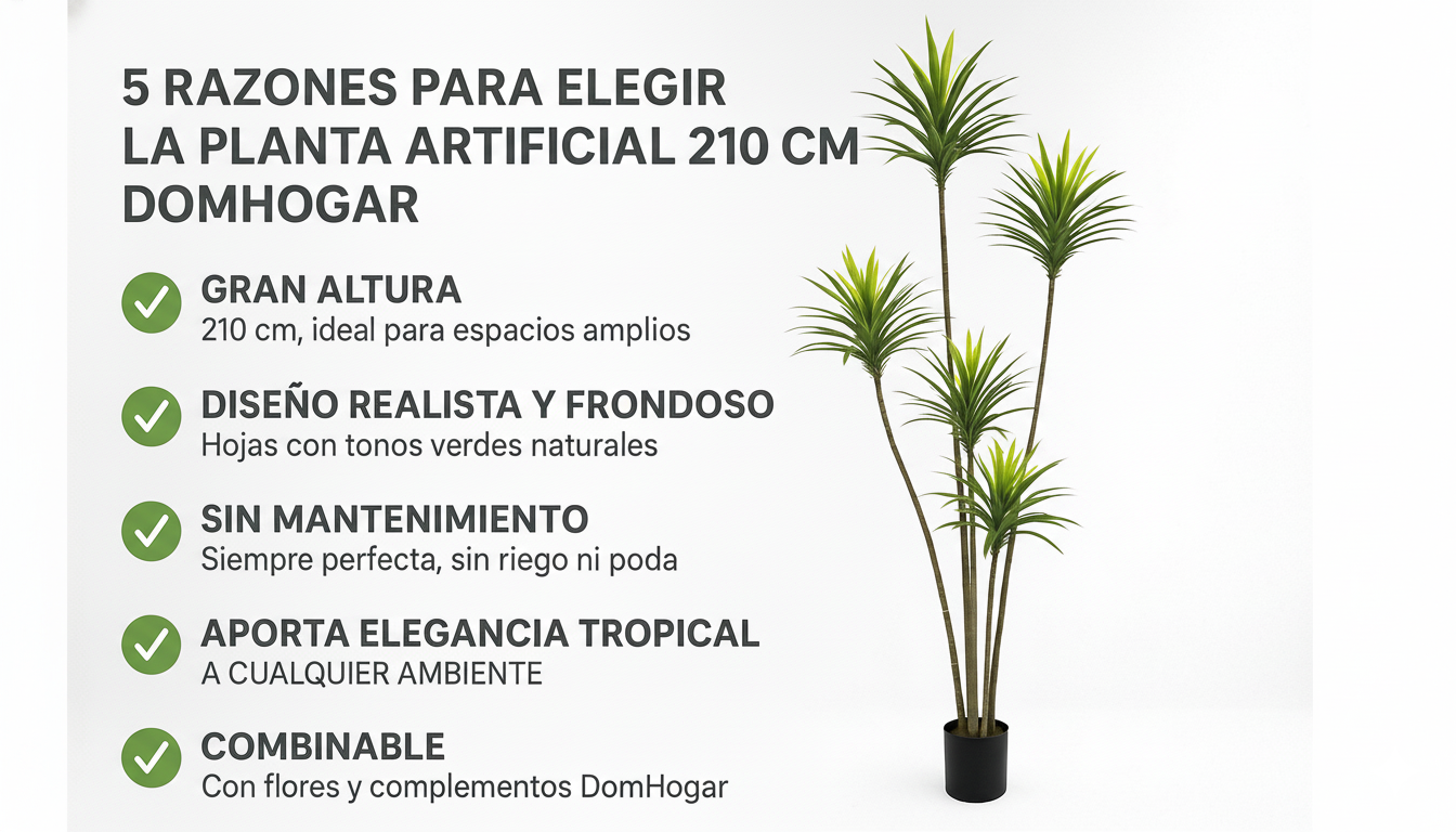 En DomHogar nos especializamos en decoración natural sin complicaciones. Nuestras plantas artificiales destacan por su realismo, durabilidad y fácil mantenimiento. La planta artificial 210 cm es la opción perfecta para quienes desean una decoración impactante y duradera.