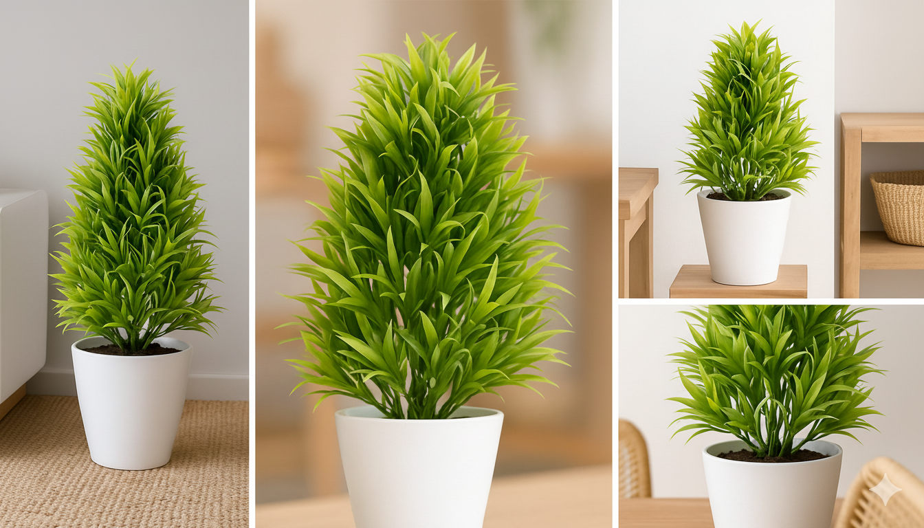 Fabricada con materiales de alta calidad, esta planta imita a la perfección el aspecto y textura de una planta natural. Sus hojas finas y variadas tonalidades verdes aportan una sensación de vida y frescura, sin necesidad de riego ni cuidados especiales.