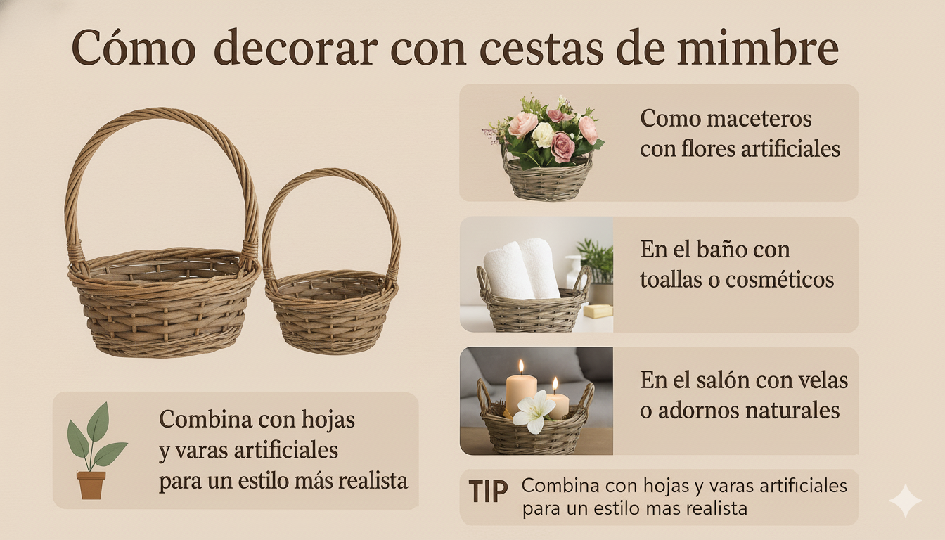 | Uso recomendado | Decoración interior, centros de mesa, cestas de regalo o macetero para flores artificiales |