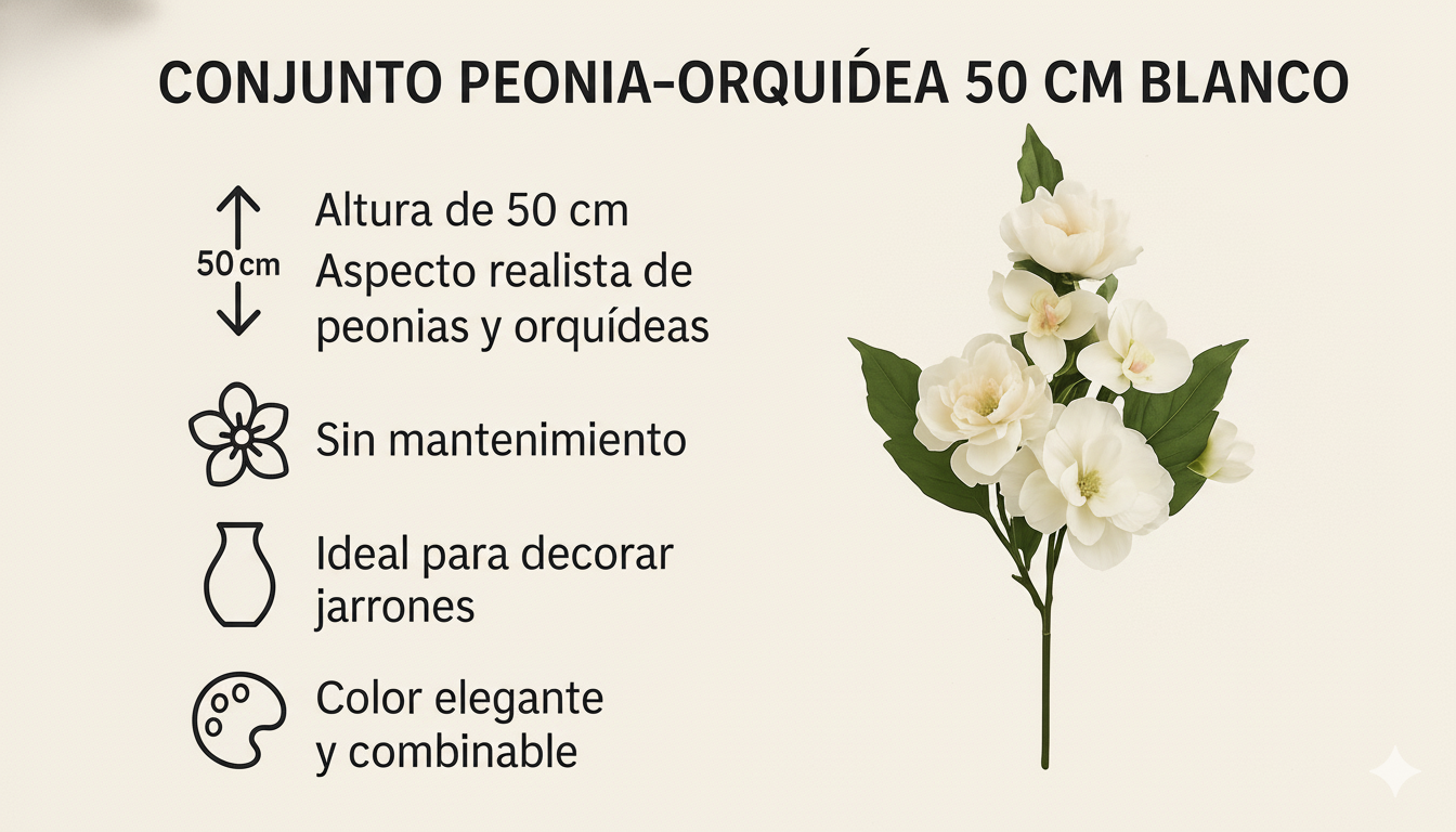 El Conjunto Peonia-Orquídea 50 cm en color blanco es una opción perfecta para quienes buscan una decoración floral sofisticada y sin complicaciones. Este ramillete combina la suavidad clásica de la peonia con la elegancia exótica de la orquídea, creando una pieza armoniosa y muy realista capaz de transformar cualquier ambiente.