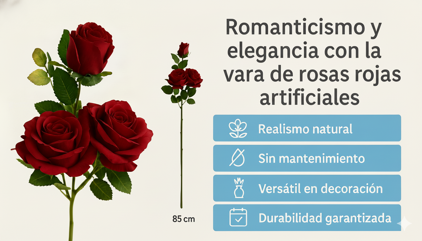 Añade belleza y distinción a tu hogar con esta vara de rosas artificiales de 85 cm. Disfruta del color y la elegancia de las rosas sin preocuparte por su cuidado. Compra ahora en DomHogar y descubre la mejor selección de flores artificiales realistas.