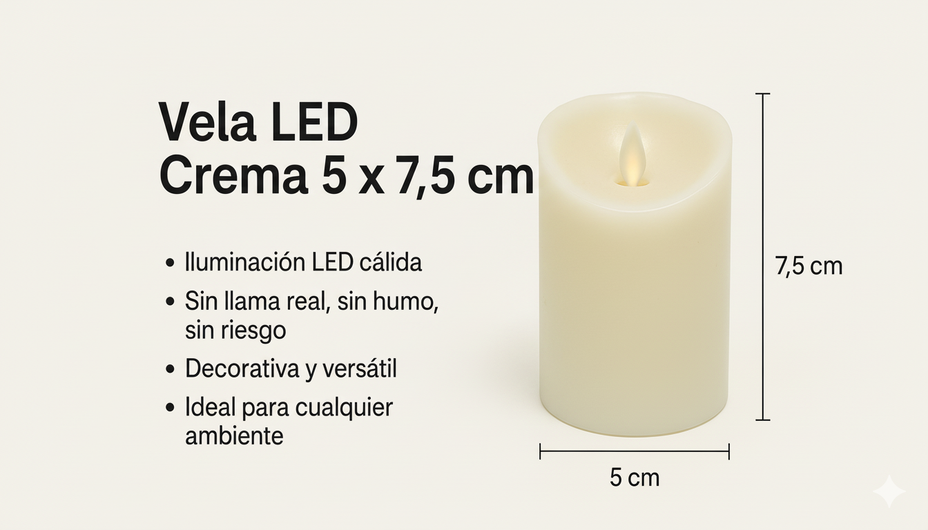 | Ficha técnica – Vela LED Crema 5 x 7.5 cm | |