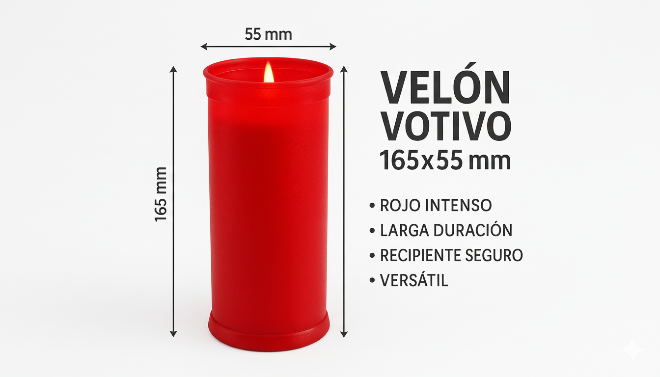 El Velón Votivo 165x55 Rojo es una opción clásica y versátil para quienes buscan una iluminación cálida, estable y con un toque simbólico. Su color rojo intenso lo convierte en un elemento ideal para espacios religiosos, altares, ceremonias y ambientes donde se desee crear una atmósfera especial.