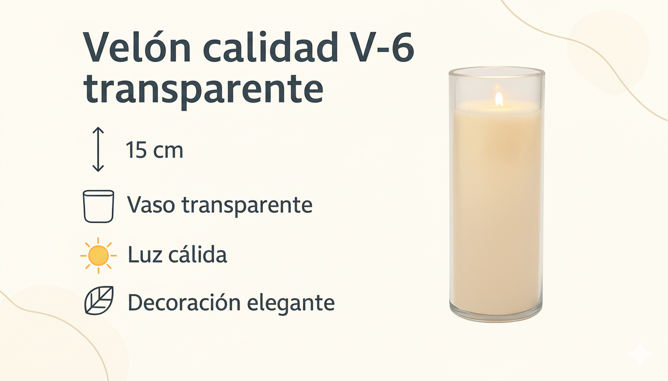 Aporta un toque de luz y elegancia a tu hogar con el Velón calidad V-6 transparente. Añádelo al carrito y descubre en DomHogar una amplia colección de velas y accesorios para iluminar tus espacios con estilo y calidez.